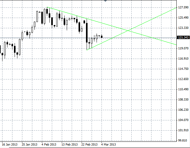Dall’analisi candlestick sul chart settimanale dell’EURUSD, è evidente come il cross si trovi in un trend ribassista, iniziato lo scorso mese con una candela decisamente ribassista come la “Marubozu Line Black” settimanale ( 4-10 Febbraio). Le ultime due candele settimanali stanno confermando e spingendo il cross al ribasso, entrambe caratterizzate da un upper shadow e una lower shadow (decisamente inferiore all’upper shadow, circa la metà). Queste candele ribassiste devono far riflettere sulla forza del trend rialzista dell’eurodollaro iniziato, difatto, a fine Luglio 2012 e proseguito con maggior forza da Novembre 2012.