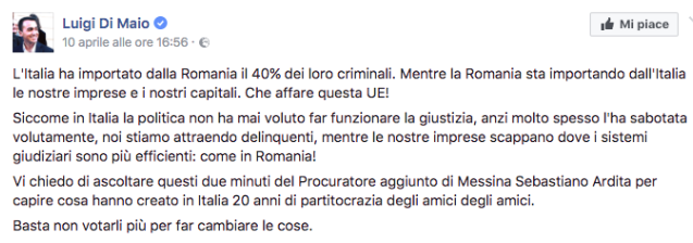 Il post apparso sulla pagina Facebook di Di Maio si rifaceva alle parole del procuratore di Messina Sebastiano Ardita il quale ha sottolineato come 4 criminali romeni su 10 abbiano scelto l’Italia come paese per delinquere. Ardita si sarebbe rifatto a quanto diffuso dal governo di Bucarest.
