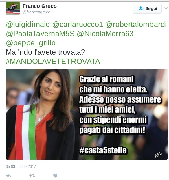 #Mandolavetetrovata: questo l’hashtag del giorno, che si diffonde in rete fra la base del Movimento 5 Stelle e gli oppositori per commentare le ultime vicende relative a Virginia Raggi, sindaca di Roma e portavoce M5S.