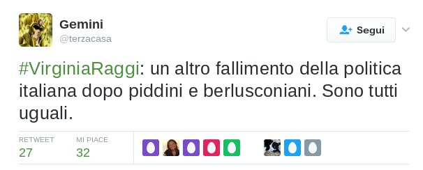 Non manca, poi, chi definisce la Raggi un fallimento e accosta il M5s a tutti gli altri, dicendo che sono tutti uguali; ma anche chi invoca le dimissioni della sindaca di Roma.
