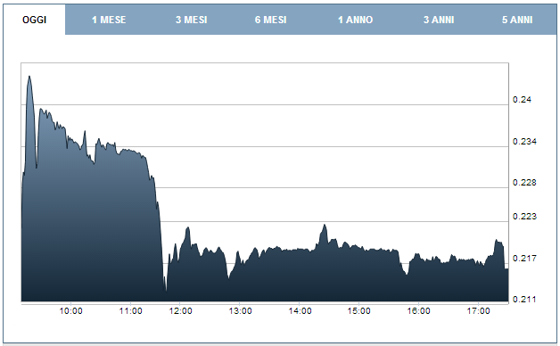 Due sedute boom quelle delle ultime 48 ore, sebbene il titolo oggi abbia chiuso con un ribasso dell’1,77% a 0,21 euro dopo l’incredibile +19% di ieri che ha colto di sorpresa analisti ed investitori dato che ad oggi non si capisce ancora chi abbia effettuato queste transazioni.