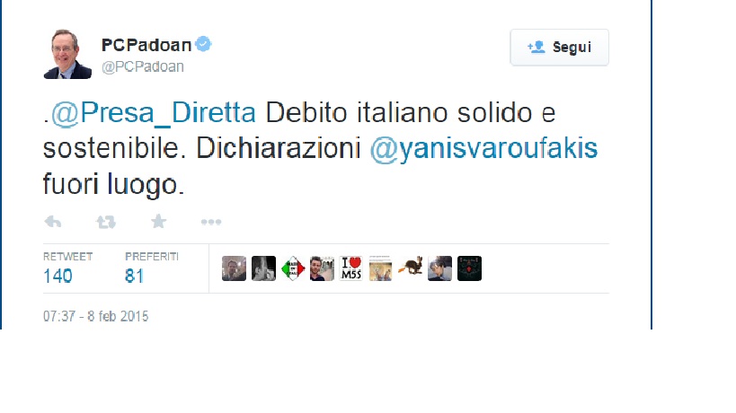 Non tarda la risposta su Twitter del ministro dell’economica del governo Renzi, Pier Carlo Padoan: