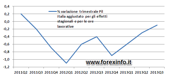 Come è possibile osservare nel grafico qui sotto, la variazione trimestrale del Pil nel terzo trimestre del 2013 è stata pari al -0,1%, con il trimestre precedente che ha segnato un -0,3%. E’ a partire dal secondo trimestre del 2011 che la crescita del Pil registra valori negativi.