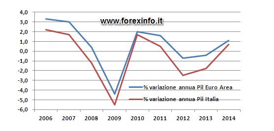 Se ci spostiamo sui dati annuali, come mostrato nel grafico qui sotto, non possiamo di certo gioire. La crescita del Pil per la fine del 2013 (dati Eurostat) è stimata ad un -1,8%, con le previsioni del 2014 pari ad un +0,7%. le attese per l’anno prossimo sono allora piuttosto modeste, tali da non permettere un’eccessiva esaltazione. La crescita del Pil annuale è infatti su territori negativi dal 2012 (nel 2011 si era registrato un modesto 0,5%.