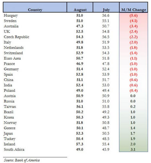 La tabella sotto riportata e contente i dati resi noti dalla Bank of America, analizza la situazione dei 26 paesi che hanno reso nota la situazione interna del settore manifatturiero nel mese di agosto. Di questi 26, 9 mostrano un miglioramento (Taiwan, Brasile, Korea, Norvegia, Grecia, Giappone, Turchia, Irlanda e Sud Africa), 2 svelano una situazione stabile (Russia e Austria), mentre altri 15 rivelano una flessione, in certi casi anche cospicua.