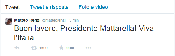 Sono passati pochissimi secondi dall’elezione di Sergio Mattarella a Presidente della Repubblica e Matteo Renzi, come da tradizione, ha già espresso la propria soddisfazione su Twitter: