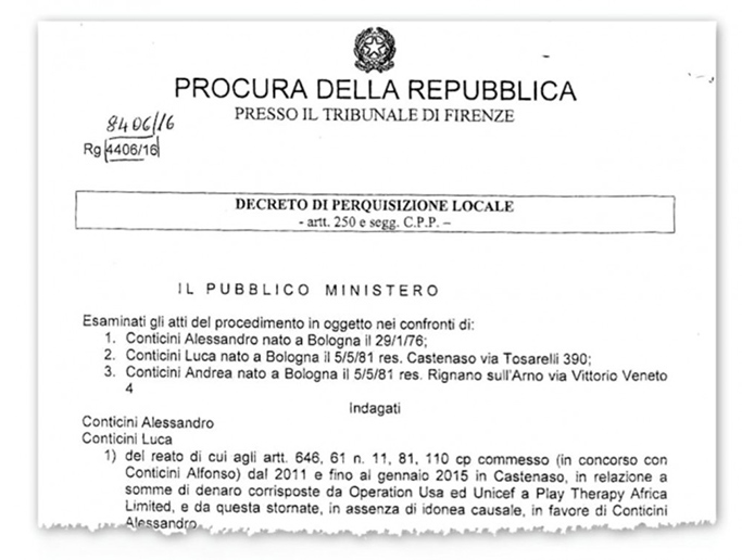 Al momento tra gli indagati ci sono Alessandro Conticini, ex dirigente dell’Unicef e socio e direttore della Play Therapy Africa LTD, e Luca Conticini fratello gemello di Andrea, il cognato di Renzi. I due sono accusati di appropriazione indebita, in concorso con il padre Alfonso, in relazione a dei fondi corrisposti da Operation Usa e Unicef alla Play Therapy Africa. Infatti, queste somme sarebbero state stornate, senza idonea causale, in favore di Alessandro Conticini.