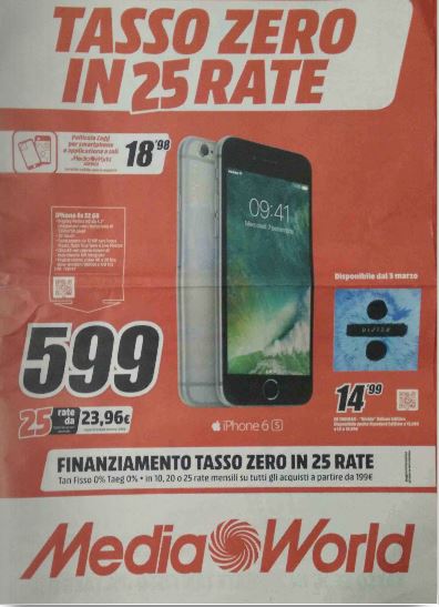 Da Mediworld questo mese torna il Tasso Zero in 25 rate: dal 2 al 15 marzo 2017 tutti gli acquisti a partire da 199€ possono essere suddivisi in 10, 20 o 25 comode rate mensili Tan fisso 0% e Taeg 0%. Ad esempio una delle offerte più interessanti del volantino Mediaworld del mese è l’iPhone 6s a 599€. Il prezzo del predecessore di iPhone 7 è sceso e in molti saranno interessati a comprarlo, considerando che possono suddividere la spesa in rate da 23,96€ al mese per 25 mesi. Anche l’iPhone 7 è sul volantino Mediaworld valido fino al 15 marzo e stiamo per scoprire con quale vantaggio possiamo portarcelo a casa.