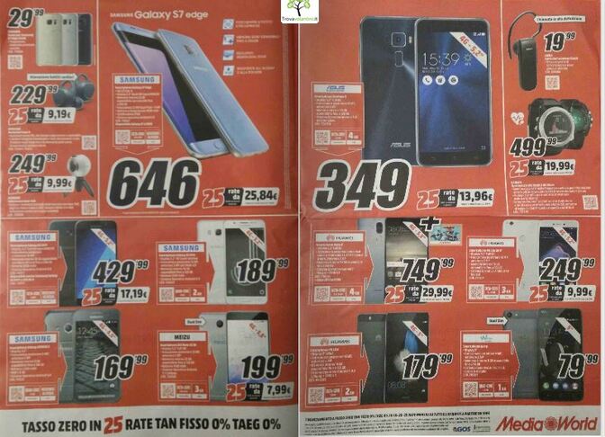 Tra le offerte volantino Mediaworld di marzo 2017 troviamo anche il Samsung Galaxy S7 Edge a 646€ da acquistare anche in comode rate da 25,84€ e il nuovo Galaxy A5 2017 che può essere sì comprato a rate (17,19€ al mese), ma il prezzo da Mediaworld rimane quello di listino: 429,99€.