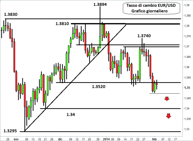 Gli analisti dell’istituto di credito transalpino sottolineano come la BCE sia sempre molto riluttante a voler tagliare il tasso sui depositi su valori negativi, anche se alla fine dovrà fare sicuramente qualcosa nel corso dell’anno per sostenere la crescita e per risollevare l’inflazione dai valori minimi attuali. Sul forex la moneta unica continua a restare sotto pressione. Il tasso di cambio euro/dollaro orbita in area 1,35, ma al momento la risalita appare molto complicata. Da un punto di vista tecnico ci sono tutti i presupposti per un calo fino in area 1,34. Più complicata la situazione sul cross euro/yen, sceso sui minimi da oltre due mesi in area 136,20: qui appare decisamente possibile un ulteriore approfondimento bearish fino a 135 o 134.