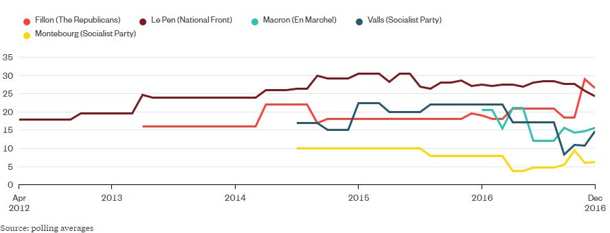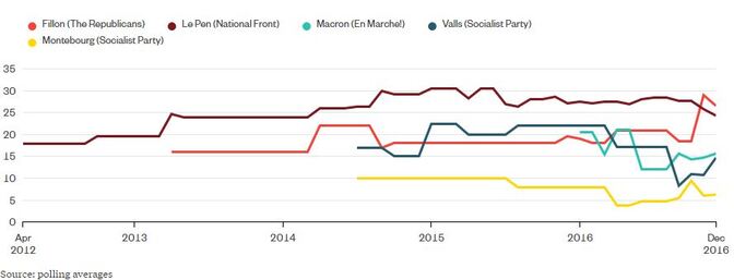 Nota: in base alla media dei sondaggi mensili di BVA, CSA, Elabe, Future Thinking, Harris Interactive, Ifop, Ipsos, Kantar Sofres, Odoxa, OpinionWay, TNS Sofres.