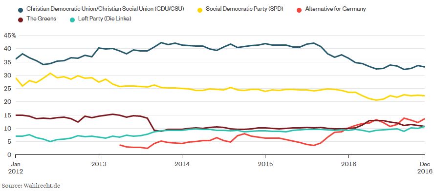 Il partito Alternativa per la Germania (AfD) sta conquistando una quota crescente di voti da tutte le parti, fattore che potrebbe rendere più difficile per il Cancelliere Angela Merkel formare una coalizione dopo le elezioni dell’autunno 2017.