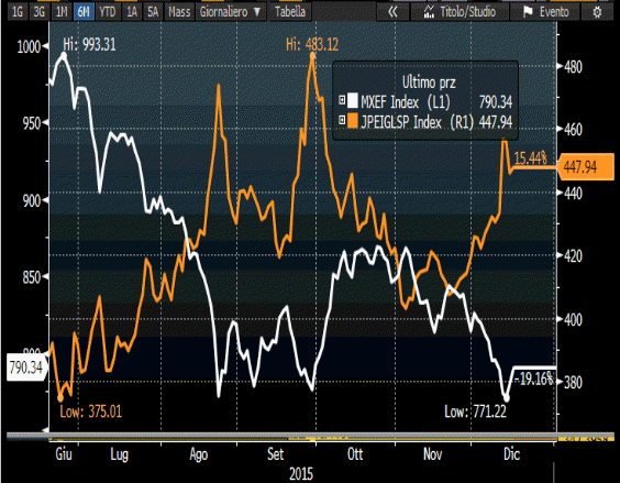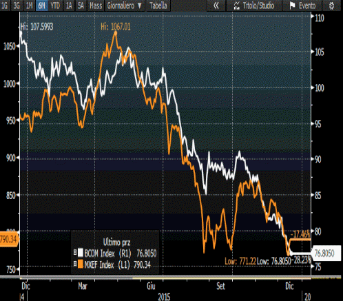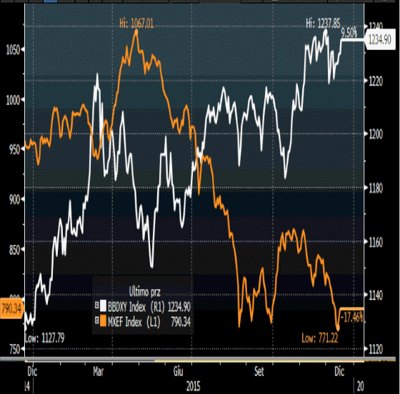 La tabella sottostante raffronta il Bloomberg Commodity Index (linea bianca ) con l’indice azionario MSCI EM (MXEF in linea arancione) da dicembre 2014 a dicembre 2015: essa rappresenta bene la forza del legame tra le due variabili, con l’ indice sulle commodities che sembra "guidare" al ribasso l’indice azionario degli EM soprattutto dalla fine di settembre ad oggi.