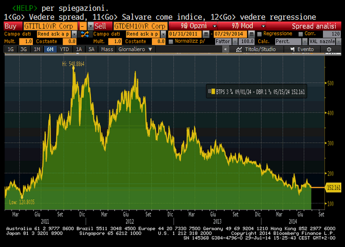 Anche per quanto riguarda i mercati obbligazionari, lo spread BTP-BUND non ha subito grandi scossoni nemmeno durante la crisi del Banco Espirito Santo ed è prontamente rientrato nell’area sottostante i 160 bps.