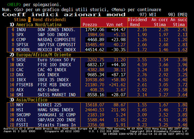 Certo, l’andamento delle azioni europee è stato altalenante nel corso del mese di luglio e le prospettive economiche per l’area euro appaiono deboli, visto che la produzione industriale a maggio è scesa del -1,1% annualizzato rispetto ad aprile e che persino il colosso industriale tedesco a maggio ha visto un calo della produzione industriale del -1,8% annualizzato rispetto al mese di aprile. Le trimestrali delle aziende europee, bisogna ammetterlo, non sono spettacolari. Ma se raffrontiamo il tasso di dividendo del DAX o del CAC con i rendimenti dei titoli governativi, la lotta è impari: dal mio monitor Bloomberg vedo che il dividend yield dell’indice azionario tedesco su utili previsti anno 2015 è del 3,25% con un tasso decennale del bund tedesco al di sotto del 1,15% e quindi con un premio al rischio di ben 210 bps per le azioni tedesche. I rendimenti dei mercati obbligazionari sono atterrati a livelli straordinariamente bassi che gli investitori continueranno a comprare azioni anche “turandosi il naso “ di fronte a risultati non strabilianti o di fronte a prospettive di crescita ancora deboli. Anche per le obbligazioni corporate.