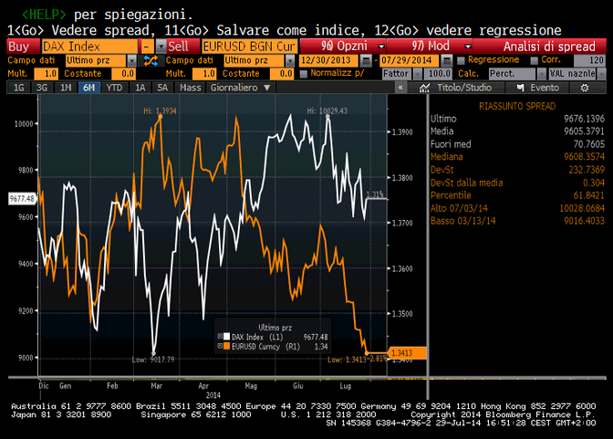 Anche visivamente (vedi tabella sottostante) il cross euro/dollaro e l’andamento del dax sono stati negativamente correlati da inizio anno sino alla fine di giugno: ritengo che il mese di luglio abbia costituito una sorta di “disturbo”, cioè di rottura temporanea della correlazione negativa tra il mercato valutario e il mercato azionario.