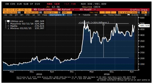 Credit Default Swap 5y su debito subordinato di Deutsche Bank dal 2015 ad oggi