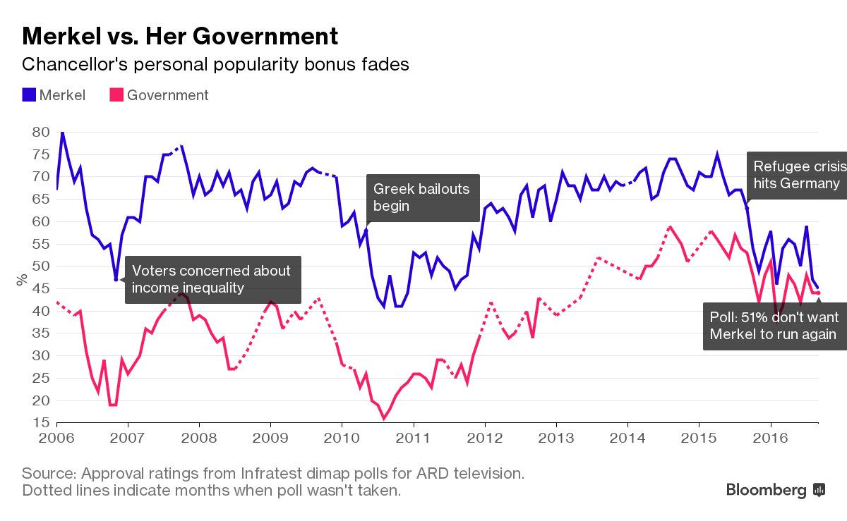 Dopo più di un decennio in cui ha combattuto diverse crisi, la Merkel è stata lodata a livello internazionale per le direzioni da essa intraprese, anche se le critiche nei suoi confronti sembrano aumentare ogni giorno che passa all’interno dei confini tedeschi. Diversi sondaggi suggeriscono ormai come il tasso di gradimento della Merkel sia in calo, soprattutto a causa della questione migranti.