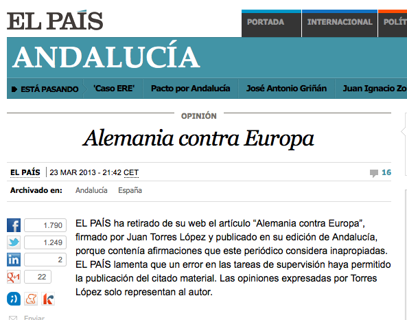 El Pais ha ritirato dal suo sito web l’articolo ’La Germania contro l’Europa’, firmato da Juan Torres López e pubblicato nella sua edizione andalusa, perché conteneva affermazioni che questo quotidiano considera inappropriate. La direzione del giornale esprime rammarico per il fatto che un errore nel dispositivo di supervisione editoriale abbia consentito la pubblicazione del materiale citato. Le opinioni espresse da Torres López rappresentano solo l’autore.