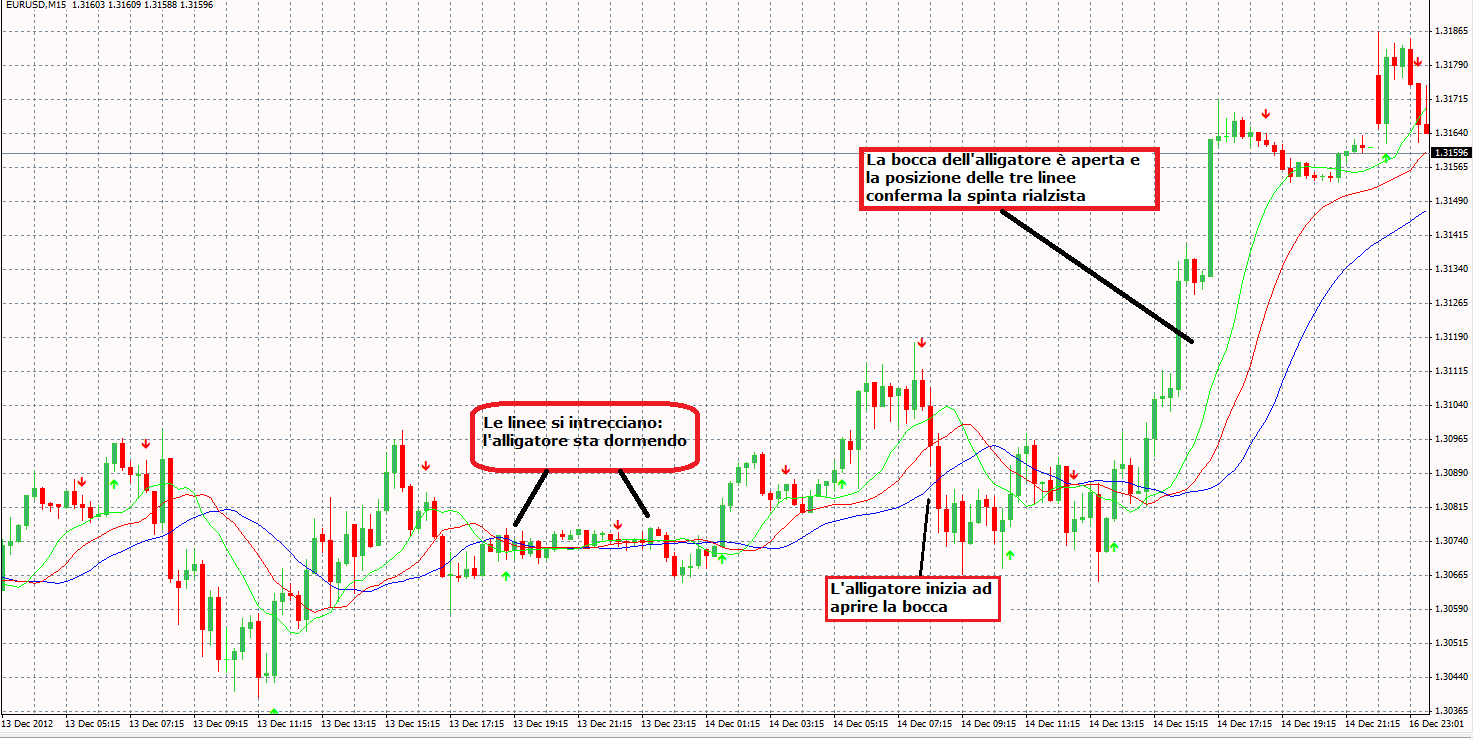 Quando la bocca dell’alligatore è aperta, i trader gli danno da mangiare aprendo posizioni, ma quando l’alligatore dorme è bene non dargli da mangiare!