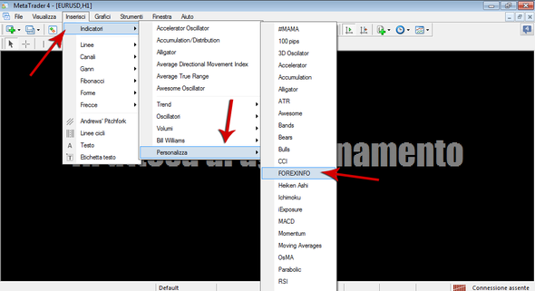 Inserisci > Indicatori > Personalizza > FOREXINFO (nel nostro caso, nel vostro dovrete ricercare il nome dell’indicatore che avete installato)