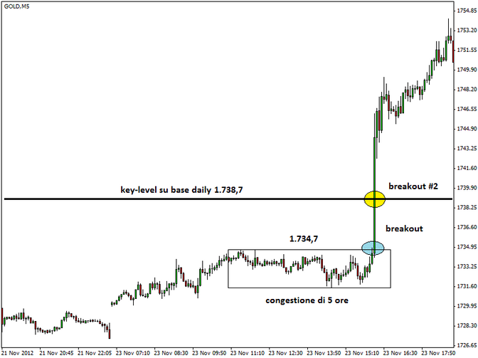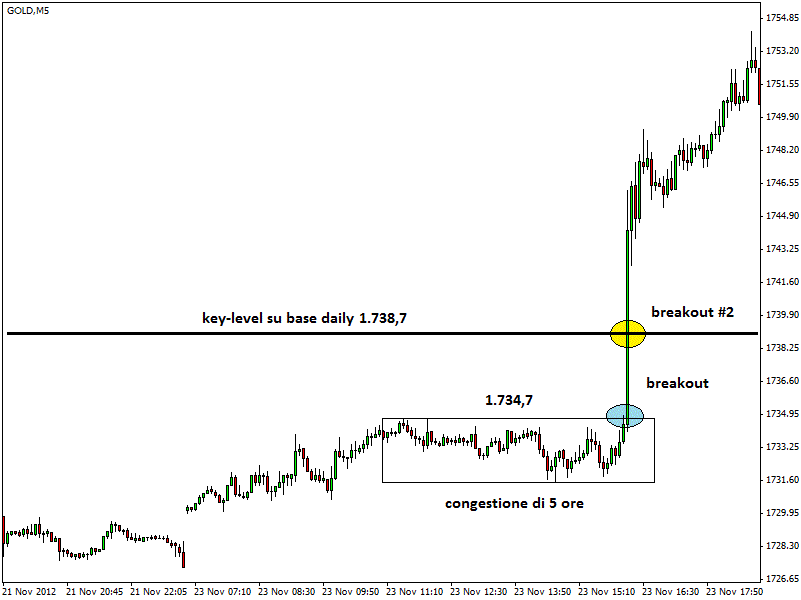 I migliori breakout del prezzo sono quelli che avvengono dopo una lunga fase di congestione e compressione della volatilità. Si tratta di una sorta di effetto-elastico, che permette spesso di cavalcare poderosi movimenti direzionali intraday. Nel case study sull’oro, grafico a 5 minuti, si può notare una stretta fase di congestione, tra l’altro presente anche su base daily. Il breakout sarà esplosivo e darà il via a uno straordinario movimento rialzista.