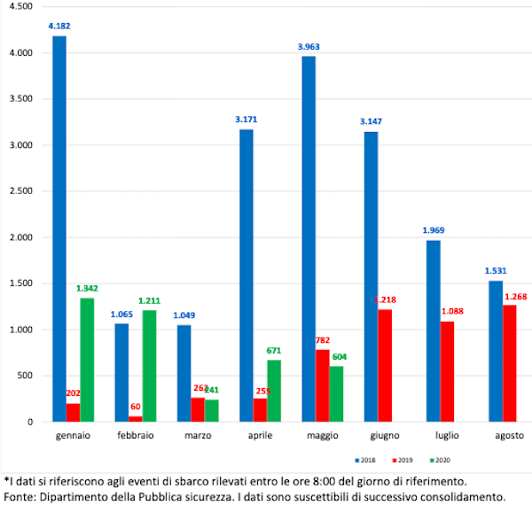 Ad aprile 2020 in Italia gli sbarchi in totale sono stati 671 contro i 255 del 2019, mentre a marzo 2020 il numero è stato di 241 leggermente più basso rispetto al 2019 quando ne furono 262.
