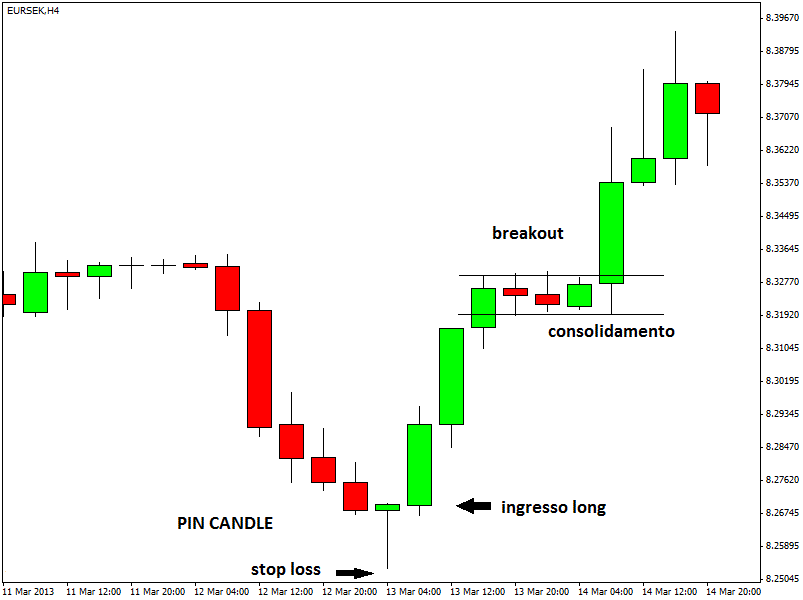L’ingresso avviene al superamento del massimo del pattern con stop loss sotto il minimo del pattern stesso (versione rialzista) oppure sulla perdita del minimo del pattern con stop loss sopra il massimo della pin candle (versione ribassista). Per capire meglio il trade management iniziale con la pin candle si può osservare il grafico a 4 ore di EUR/SEK (euro su corona svedese), che presenta il pattern nella versione long.