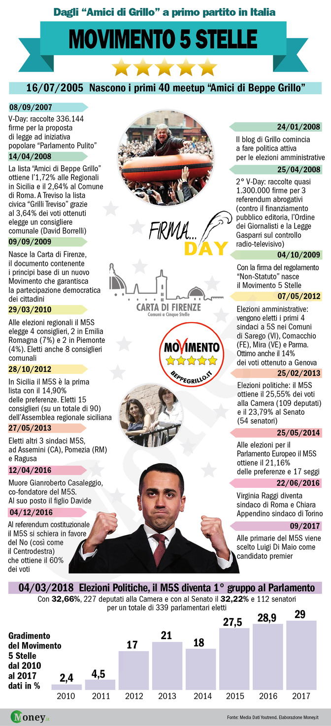 Quali sono state le tappe che hanno fatto del Movimento 5 Stelle il primo partito in Italia? Ripercorriamole insieme in questa infografica sulla cronistoria dei pentastellati; per maggiori informazioni, invece, potete consultare il nostro articolo di approfodimento su come ha fatto il Movimento 5 Stelle a diventare primo partito in Italia.