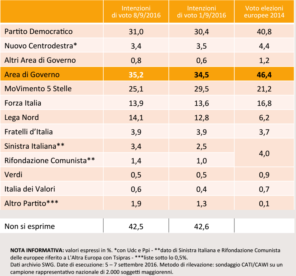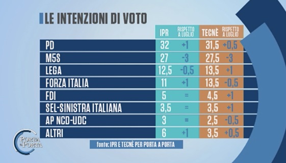 Concordano con l’analisi di SWG anche IPR e Tecnè, che nei sondaggi effettuati per il programma di Rai Uno Porta a Porta hanno evidenziato una flessione del 3% per il Movimento 5 Stelle rispetto a luglio e una parallela crescita dell’1% (IPR) e dello 0,6% (Tecnè) per il Partito Democratico.