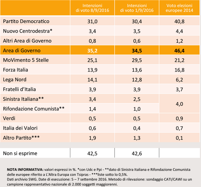 I dem, infatti, stando ai dati SWG, sarebbero saliti solo dello 0,6%, passando dal 30,4% al 31%. Il partito guidato da Matteo Salvini ritorna ai livelli di qualche mese fa e raggiunge il 14,1%, mentre Forza Italia si attesta al 13,9%. Sinistra Italiana invece supera la soglia di sbarramento prevista dall’Italicum e passa dal 2,5% al 3,4%.