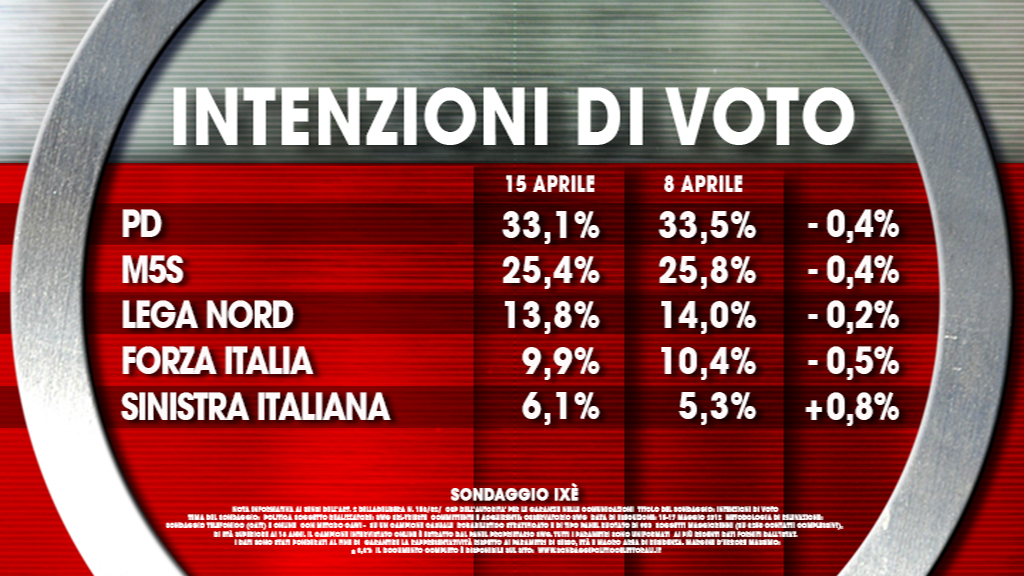 Il primo partito è ancora il PD, che nonostante sia sceso dello 0,4% resta in vetta con il 33,1% delle preferenze. Seguono il Movimento 5 Stelle con il 25,4% (-0,4%) delle preferenze e la Lega Nord con il 13,8% (-0,2%). Periodo difficile per Forza Italia, che stando ai sondaggi politici Ixè non supera nemmeno il 10%.
