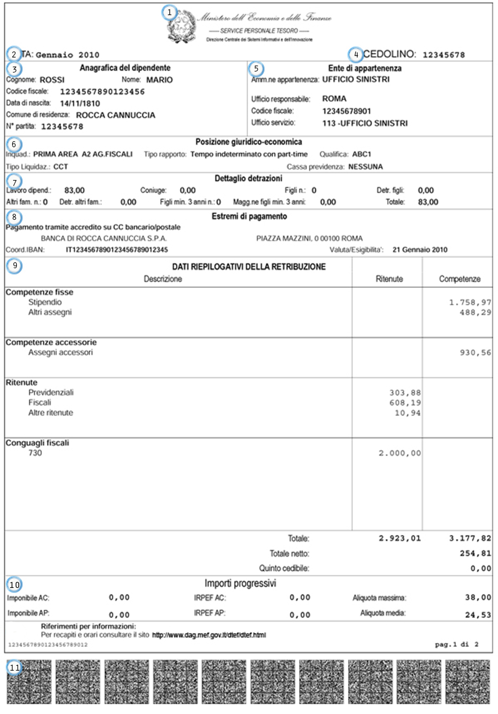 Nella parta alta del cedolino troviamo innanzitutto il logo del Ministero dell’Economia e delle Finanze (1) più la rata (2), ovvero il mese e l’anno a cui fa riferimento lo stipendio.