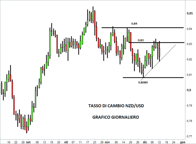 Sul forex il dollaro neozelandese resta piuttosto stabile, facendo decisamente meglio della valuta di Sidney che ormai è in caduta libera. Il tasso di cambio NZD/USD è stato però respinto dalla barriera grafica formatasi poco sopra 0,83. Anche ieri il Kiwi non è andato oltre quota 0,8320 e a questo punto appare probabile un approfondimento ribassista verso 0,8150 prima e 0,8080 poi. Stamattina il cambio quota poco sopra 0,82, ma nel breve termine ha perso la forza necessaria per tentare un allungo rialzista verso le resistenze di area 0,84.