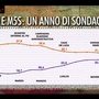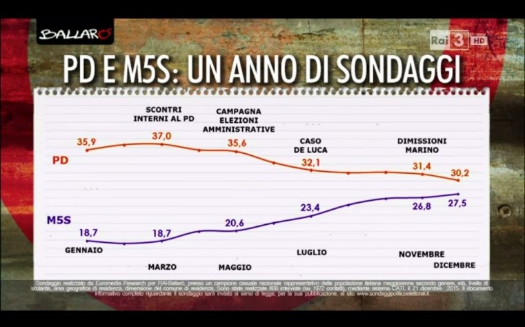 Nell’ultima puntata di Ballarò del 2015 è stato mandato in onda il grafico che ha mostrato l’andamento dei due partiti nei sondaggi politici svolti nel corso dell’anno che si è appena concluso: come si può notare, le due forze politiche hanno avuto un andamento quasi speculare, con il PD che partiva con un vantaggio di 17 punti percentuali e ha chiuso il 2015 con un distacco minimo, addirittura inferiore al 3%.