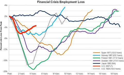 Questo grafico fu realizzato da un economista dello stato dell’Oregon, Josh Lehner: con la linea rossa, l’economista mostra i cambiamenti in materia di occupazione a partire da quando è iniziata l’ultima recessione, ovvero Dicembre 2007. Con questo mostra che, per quanto difficile sia la situazione lavorativa degli Stati Uniti degli ultimi anni, sicuramente la storia ha visto periodi molto più bui, come ad esempio quelli che hanno fatto seguito alle crisi finanziarie di Finlandia e Svezia nel 1991 e Spagna nel 1977, o degli stessi Stati Uniti durante il periodo nero della Grande Depressione del 1929.