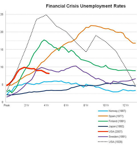 La giornalista del New York Times fa poi un passo indietro e riporta il pensiero di due economisti di Harvard, Carmen Reinhart e Kenneth Rogoff, i quali hanno scritto, "le crisi finanziarie sono sempre particolarmente disastrose. Nel corso di una dozzina di crisi finanziarie di paesi sviluppati e in via di sviluppo che risalgono fino alla Grande Depressione, il tasso di disoccupazione è aumentato in media di 7 punti percentuali nel corso di 4,8 anni". E in effetti, nota l’economista americana, se si mettono a confronto i dati relativi alle perdite di lavoro causate da altre crisi finanziarie con quelli della più recente crisi finanziaria americana, i risultati non sono poi così raccapriccianti e mostra così il seguente grafico: