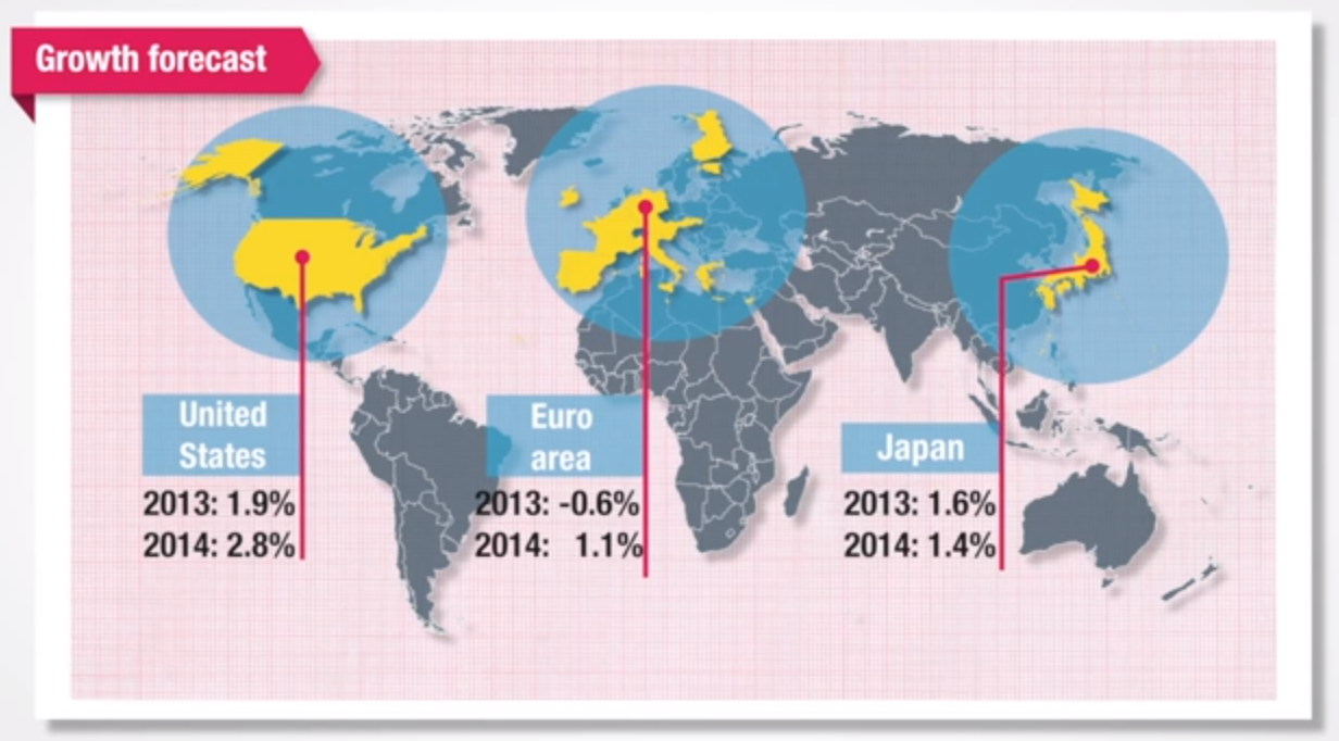 Secondo le previsioni, gli Stati Uniti cresceranno più velocemente rispetto alle altre grandi economie. In Giappone la crescita sarà piuttosto irregolare, con un tasso del 1.6% nel 2013 e del 1.4% nel 2014. Nell’Eurozona, invece, continuerà la recessione per tutto il 2013, prima di un graduale miglioramento nel 2014.