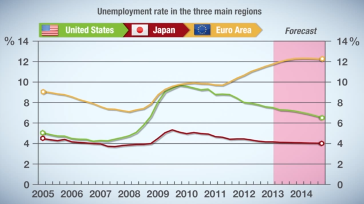 L’occupazione sta aumentando negli Stati Uniti mentre rimane piuttosto stabile in Giappone. Tuttavia, è in Europa che il tasso di disoccupazione continua ad aumentare e rappresenta una vera e propria sfida, visto che secondo le previsioni si stabilizzerà ad un livello straordinariamente alto nel 2014.