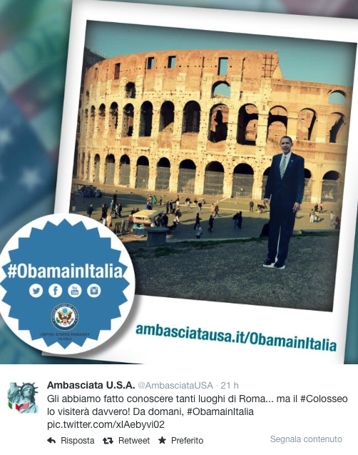 Roma attende l’arrivo del presidente Obama. L’arrivo è previsto per questa sera a Fiumicino, per l’occasione le misure di sicurezza sono estese al massimo. La città eterna è blindata e nelle prossima ore alcune zone saranno off limits. L’ambasciata Usa per annunciare sui social la notizia dell’arrivo di Obama e seguire il suo tour nella capitale ha lanciato l’hastag #ObamainItalia.