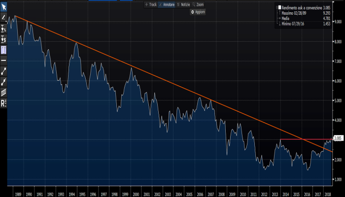 Dal punto di vista meramente grafico è interessante notare come l’andamento dei rendimenti abbia sempre seguito la linea di tendenza evidenziata in arancione nel grafico, per poi romperla durante i primi mesi del 2018.