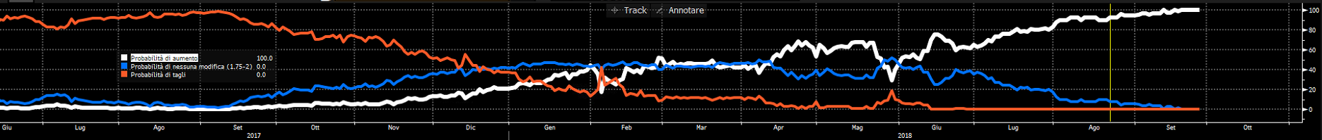 Come si può vedere dal grafico, gli analisti danno oramai per certo un rialzo dei tassi durante il meeting di stasera. È bene notare però come dal 21 agosto scorso, data in cui la probabilità relativa ad un rialzo dei tassi si attestava nell’intorno del 91%, l’andamento del T-Note Future ha iniziato a costruire un’altra gamba di ribasso.