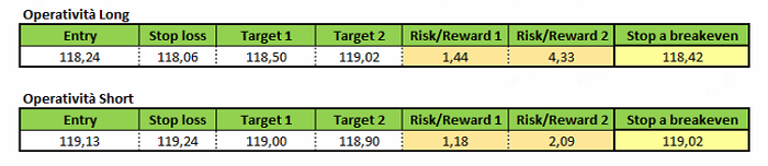 Se invece si volessero adottare strategie di matrice ribassista, si potrebbe sfruttare un eventuale rimbalzo per costruire una posizione. Il punto di entrata si potrebbe trovare nell’intorno dei 119,13 dollari. Lo stop loss in questo caso sarebbe individuabile a 119,24 punti, l’obiettivo principale a 118,25 dollari e obiettivo finale a 118,10 dollari.
