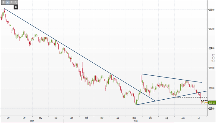 I corsi hanno iniziato ad apprezzarsi formando una figura di doppio minimo. Da queste aree si potrebbe quindi assistere ad un rimbalzo tecnico delle quotazioni, che avrebbe le potenzialità per estendersi in un primo momento fino a 119,02 dollari. Se tale resistenza venisse violata, ci si potrebbe attendere un aumento della pressione rialzista che porterebbe il derivato a testare la linea di tendenza che collega i minimi del 17 maggio con quelli del primo agosto 2018.