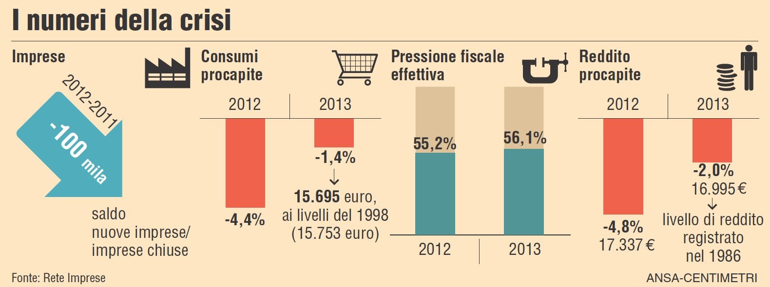 “Il calo dell’1,6% previsto per il 2013 è l’ultimo atto di una contrazione dei consumi che ha portato le famiglie a ‘tagliare’ 85 miliardi nei cinque anni precedenti (2008-2012), metà dei quali (più di 43) solo nel 2012. Un taglio di 3.500 euro per ciascuna famiglia italiana: è con questa eredità pesantissima che si deve fare i conti”.