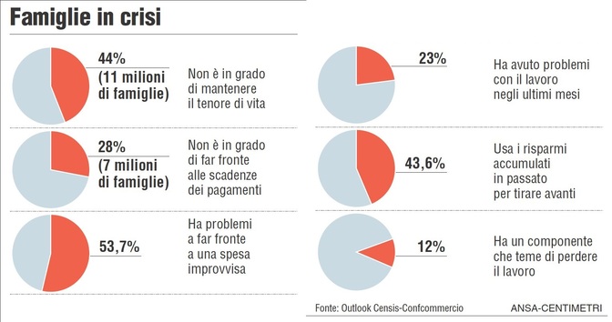 Ecco i dati del Censis, aggiornati al mese di aprile 2013, sulle famiglie in crisi.