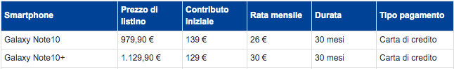 Iniziamo da Tim. L’operatore blu ha inserito i nuovi Galaxy Note nel listino di smartphone Samsung acquistabili a rate. Come riportato nella tabella seguente (fonte: www.tim.it), per acquistare il Note10 a rate con Tim bisognerà dare un contributo iniziale di 139 euro e rate da 26 euro al mese per 30 mesi; per il Note10+ il contributo iniziale è pari a 129 euro con rate mensili da 30 euro per una durata di 30 mesi. In entrambi i casi è possibile l’acquisto solo con carta di credito.
