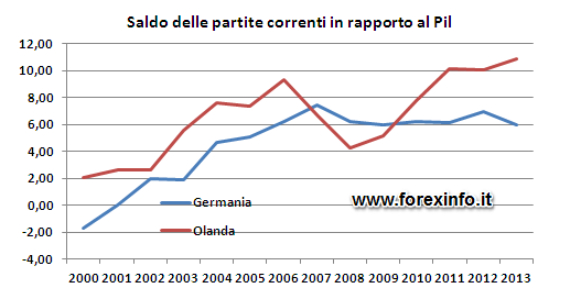 L’altra nota positiva riguarda il saldo positivo con l’estero (addirittura più elevato di quello tedesco) come possiamo notare dal grafico quì sotto. Un simile risultato consente all’Olanda di attuare una forma di ripagamento graduale del debito molto meno devastante rispetto a quanto avvenuto, ad esempio, in Spagna, paese che non è riuscito a controbattere l’indebitamento privato con maggiore liquidità derivante dall’estero.