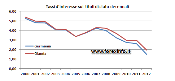 Vi sono però alcuni indicatori che lasciano ben sperare per l’economia olandese. Il downgrade di S&P’s non dovrebbe essere preoccupante per il costo dell’indebitamento pubblico, poichè quest’ultimo rimane molto basso. Le obbligazioni pubbliche olandesi pagano (e hanno pagato) tassi d’interesse di poco superiori a quelli tedeschi, come possiamo notar dal grafico qui sotto; al momento lo spread con i Bund tedeschi si assesta intorno ai 30 punti base.