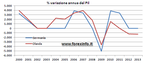 Come si può osservare dal grafico, a partire dal 2009 la Germania ha mostrato tassi di crescita del Pil superiore (o comunque cadute del Pil inferiori) rispetto ai propri vicini.
